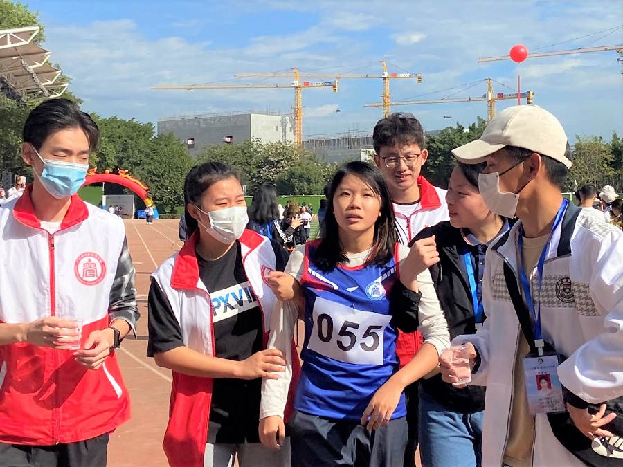教职工党员、学生党员在党员服务点积极协助校运会工作,在自己参加比赛之余,仍不忘坚守在各自的岗位上,确保校运会的有序开展。服务点配备医疗箱,外伤应急药品,为运动员们提供最及时有效的医疗保障。比赛前贴心提醒运动员注意热身运动,比赛时热情为我院参赛选手呐喊加油,比赛后及时关注运动员的身体状况,终点处一对一接护,为运动员贴心递上了纸巾和水,搀扶身体不适的运动员前往服务点休息。党员服务队的每一位同志,都在尽自己所能,为健儿们加油鼓劲,并做好后勤服务保障工作。那一抹红色也成为了运动场上一道靓丽的风景线,充分发挥了党员同志们的先锋模范带头作用,为低年级的同学们树立了榜样。