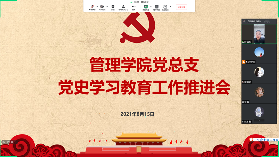 为深入学习贯彻习近平总书记在庆祝中国共产党成立100周年大会上的重要讲话精神,扎实推进党史学习教育工作,引导党员切实增强“四个意识”、坚定“四个自信”、做到“两个维护”,做到党史学习教育暑期不断线,8月15日晚上,管理学院党总支在“腾讯会议”App召开暑期党史学习教育工作推进会议,管理学院党总支书记汪椿东参加并主持会议,各支部书记及支委参加会议。