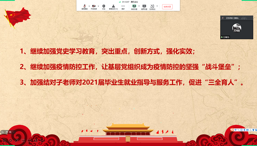 汪椿东对各党支部取得的阶段性成效给予充分肯定,并对下一阶段党史学习教育工作提出了三点要求:一是要继续深化加强学习。要按照学校党委的要求和学院总支的安排,继续做好“每周一报”,扎实开展党史学习教育;二是突出全面系统学习,持续推动潜心自学。把学党史同学懂弄通做实习近平新时代中国特色社会主义思想结合起来,同学习贯彻习近平总书记关于教育的重要论述特别是关于高等教育的重要指示精神结合起来,同学习贯彻习近平总书记重要讲话精神结合起来,努力做到学深悟透,融会贯通;三是要工作上再细化。要不折不扣完成规定动作,精准发力提升学习效果,系统安排提高学习质量,总结经验抓出特色亮点;四是要做到学史力行。将党史学习教育与疫情防控工作结合起来,让基层党组织成为疫情防控的坚强“战斗堡垒”,要积极落实“我为群众办实事”,加强结对子老师对2021届毕业生就业指导与服务工作,促进“三全育人”。