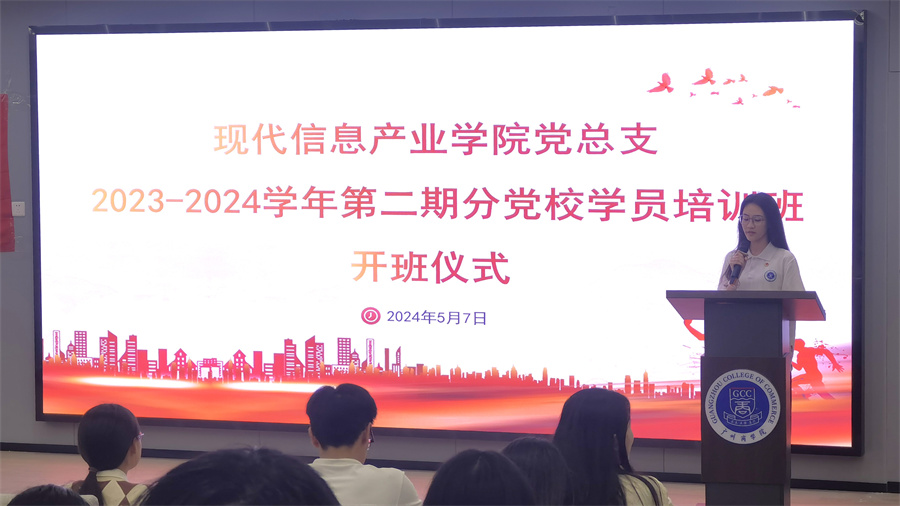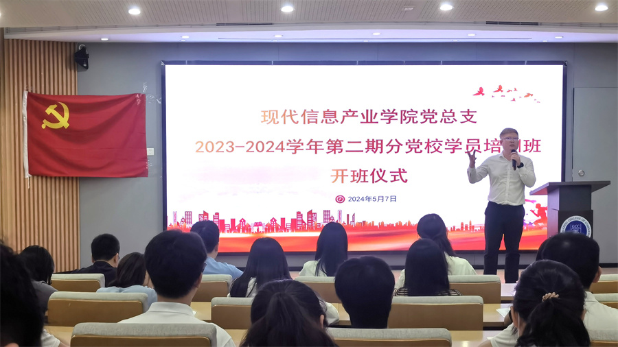 为加强入党积极分子的教育培养,增强其政治理论素养和党性修养,提高思想觉悟与实践能力。现代信息产业学院党总支于5月7日晚在第八教学楼101报告厅举行2023-2024学年第二期分党校学员培训班开班仪式。学院党总支书记、副院长、分党校校长关树基,学生第三党支部书记、分党校班主任潘慧颖,学生第一党支部书记许丽琴,学生第二党支部书记胡富铭及各年级辅导员出席本次开班仪式。