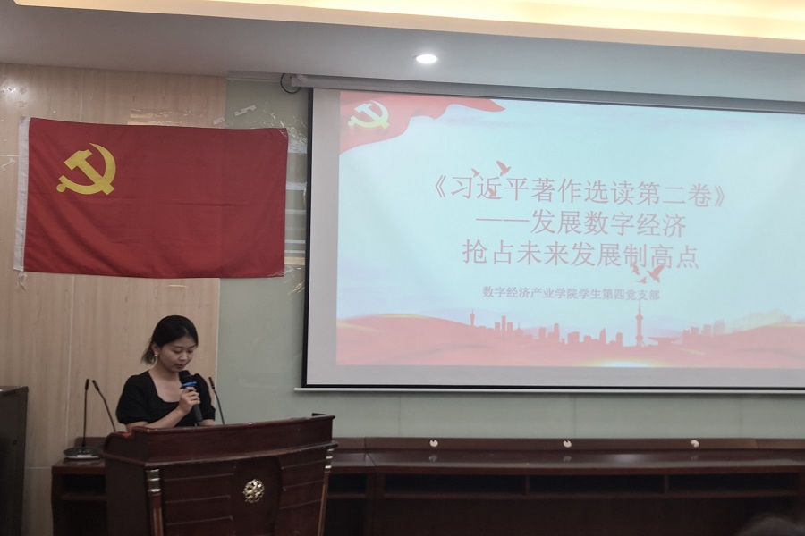 会上,陈雅玲带领支部成员精读《习近平著作选读第二卷》中“发展数字经济,抢占未来发展高制高点”的原文内容。她从数字经济的概念、发展数字经济意义和如何发展数字经济三个方面带领支部成员进行学习,并将学习内容与学院专业特色相结合。她强调,身为数字经济产业学院的学子,在这个数字经济飞速发展的时代,更要认真学好专业知识,增强自己的核心竞争力,顺势而为,奋发有为,把个人志向融入国家发展,把个人的理想追求融入党和国家的事业之中,努力成为数字创新的主力军和数字经济的最积极的创造者。