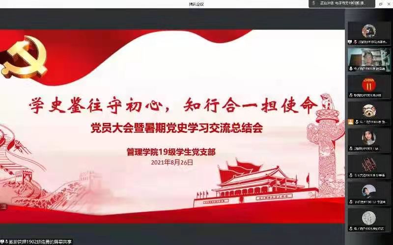 管理学院2019级学生党支部全体党员充分利用暑期时间进行学习实践,本次大会通过第一议题学习、党史宣讲、交流发言等形式,将党史学习教育和支部发展紧密结合起来,引导全体党员以对人民群众高度负责的态度,以时不我待的使命感和责任感,将党史学习教育成果转化为干事创业的精神动力,在为群众办实事中发挥青年大学生党支部战斗堡垒作用。