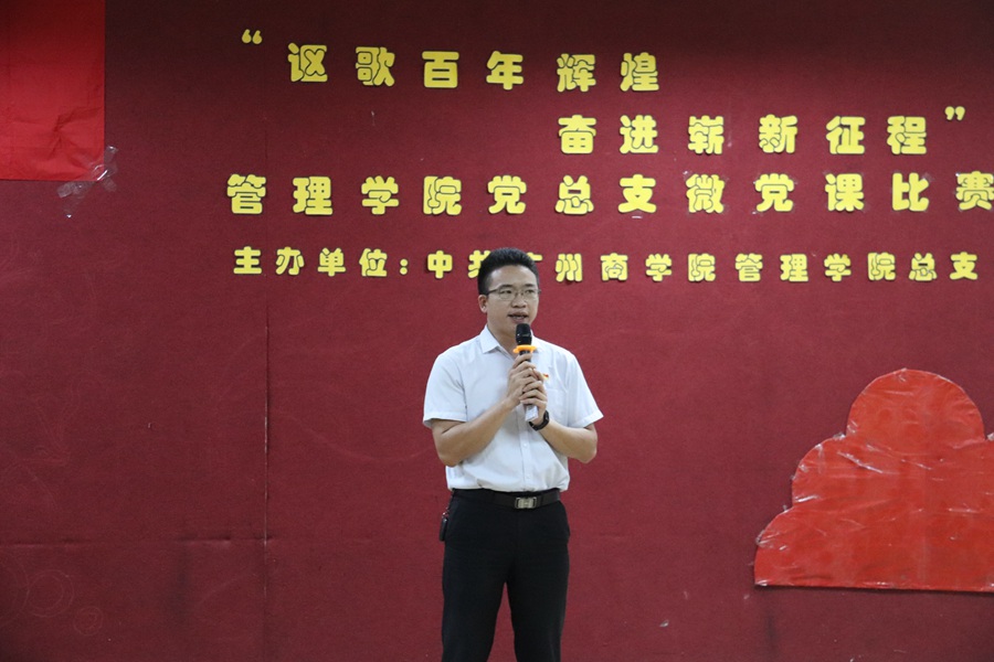 为学习贯彻习近平总书记在党史学习教育动员大会上的重要讲话精神,营造良好的学习氛围,提升学习成效,让红色基因、革命薪火代代传承,管理学院党总支于6月24日晚在一教206开展了“讴歌百年辉煌,奋进崭新征程”微党课决赛,参加活动的嘉宾及评委有管理学院党总支书记汪椿东、辅导员刘智莹、李文娣、蔡俊发、李俞妍、张亚珍,学生党员代表洪晓、潘慧颖。