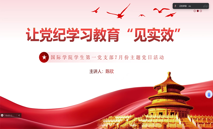 为深入开展党纪学习教育,进一步增强党员的纪律意识,让党纪学习教育“见实效”,7月18日晚上,国际学院学生第一党支部在腾讯会议平台开展以党纪学习教育为主题的线上党日活动。本次活动由国际学院学生第一党支部书记陈欣担任主讲人。