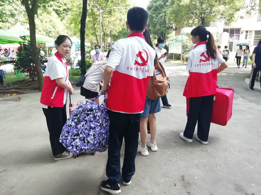 管理学院主要在大本营报到处和学生公寓设立学生党员迎新服务点,主要负责协助新生的注册报到与交费、新生办理手续指引、新生公寓入住及防诈骗宣传等内容,在学校北门设立教师党员服务岗,协助做好体温监测、查看健康码等入校准备工作。各位党员各司其职,充分发挥党员的先锋模范作用,热情地接过新生们的行李箱,引领他们到报到处办理注册报到手续,积极为他们答疑解惑,保证学校在疫情防控期间新生顺利报到。