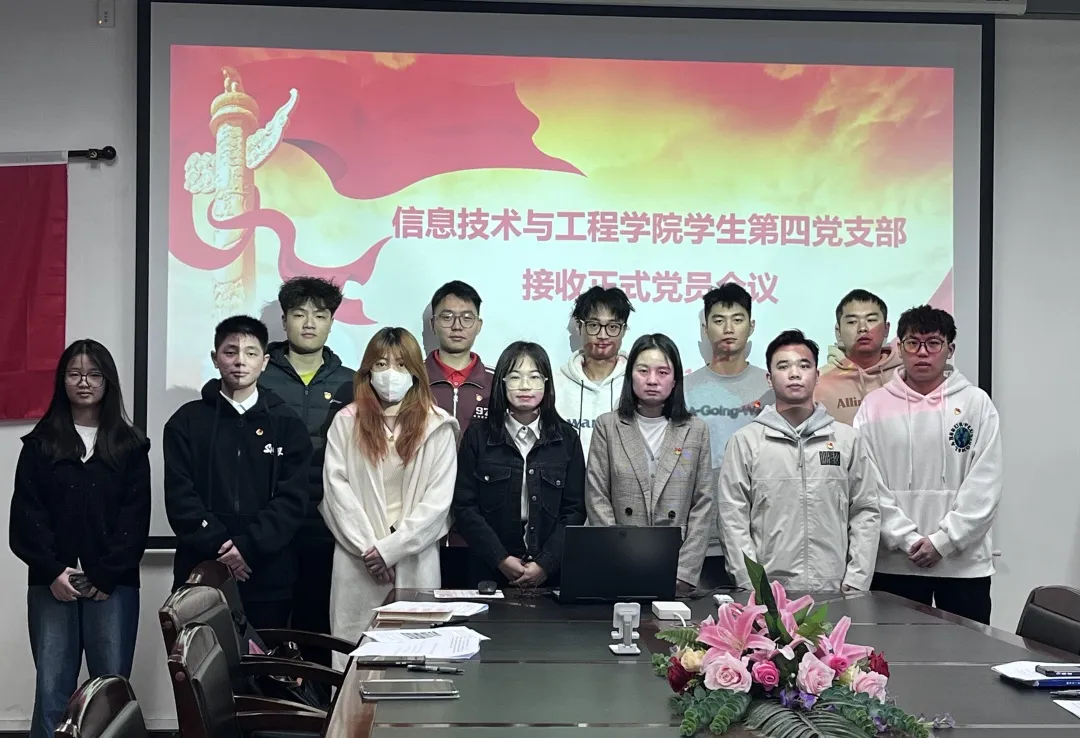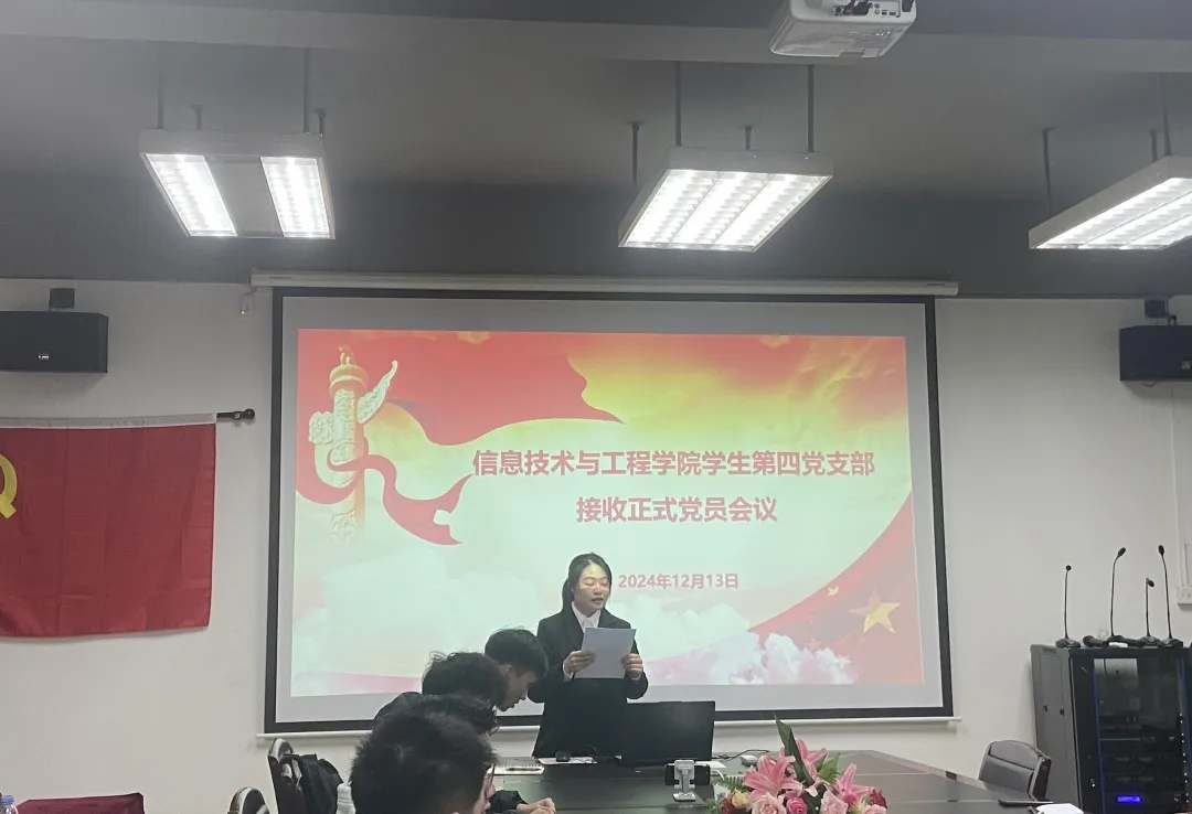 会议严格按照党组织预备党员转正流程进行。与会成员全体起立,奏唱国歌,在庄严肃穆的国歌声中,信息技术与工程学院学生第四党支部预备党员转正大会正式拉开序幕。